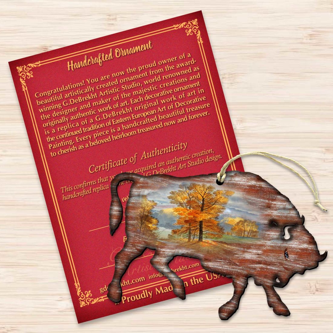 Looking for Christmas Tree Ornaments? Our Ornaments Set with Buffalo will make a great gift this holiday season. Beautifully detailed to create a nostalgic look. High-quality, sturdy and lightweight wood. Handcrafted in the USA