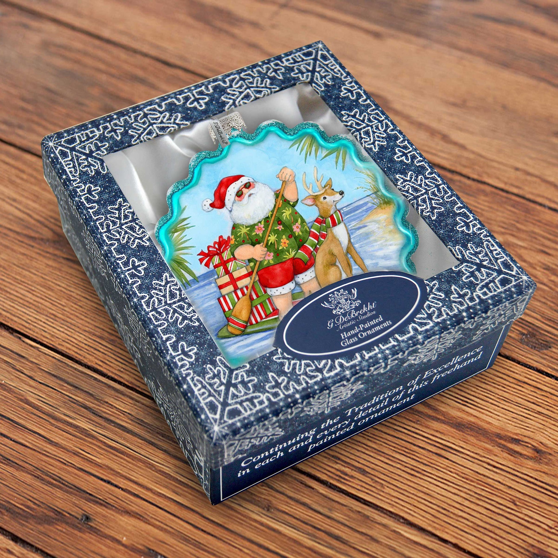 Christmas Decoration - Handblown Glass - Paddle Boarding Santa - Christmas Tree Ornament by Susan Winget - Handmade Gift - Wooden Ornament - 759-115-SW