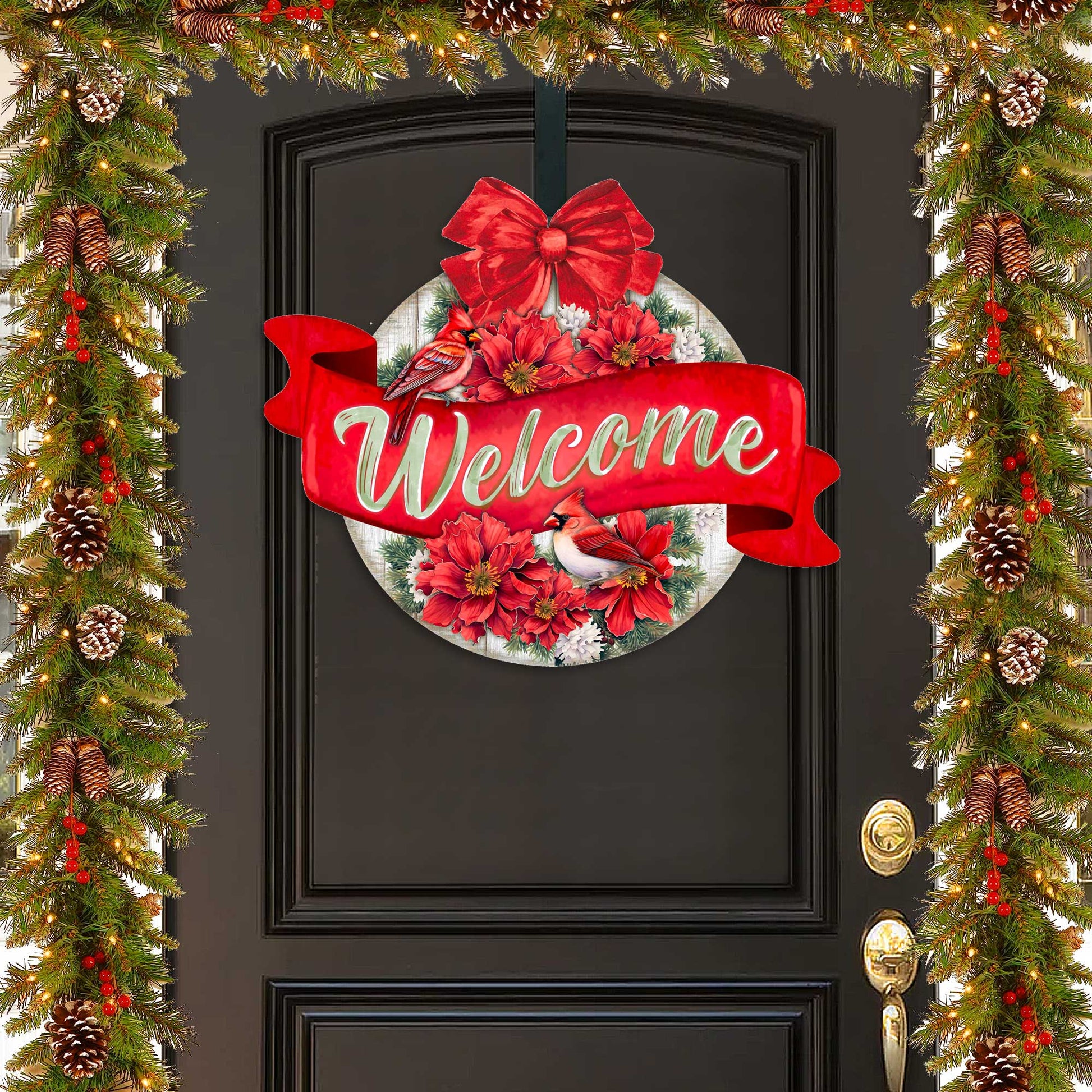 Welcome visitors to your home with this festive Christmas-themed welcome sign, featuring a beautiful Christmas wreath with two Cardinals perched on top of it. This decorative door banner is crafted of natural wood. Display it proudly outside your home to make a lasting impression.