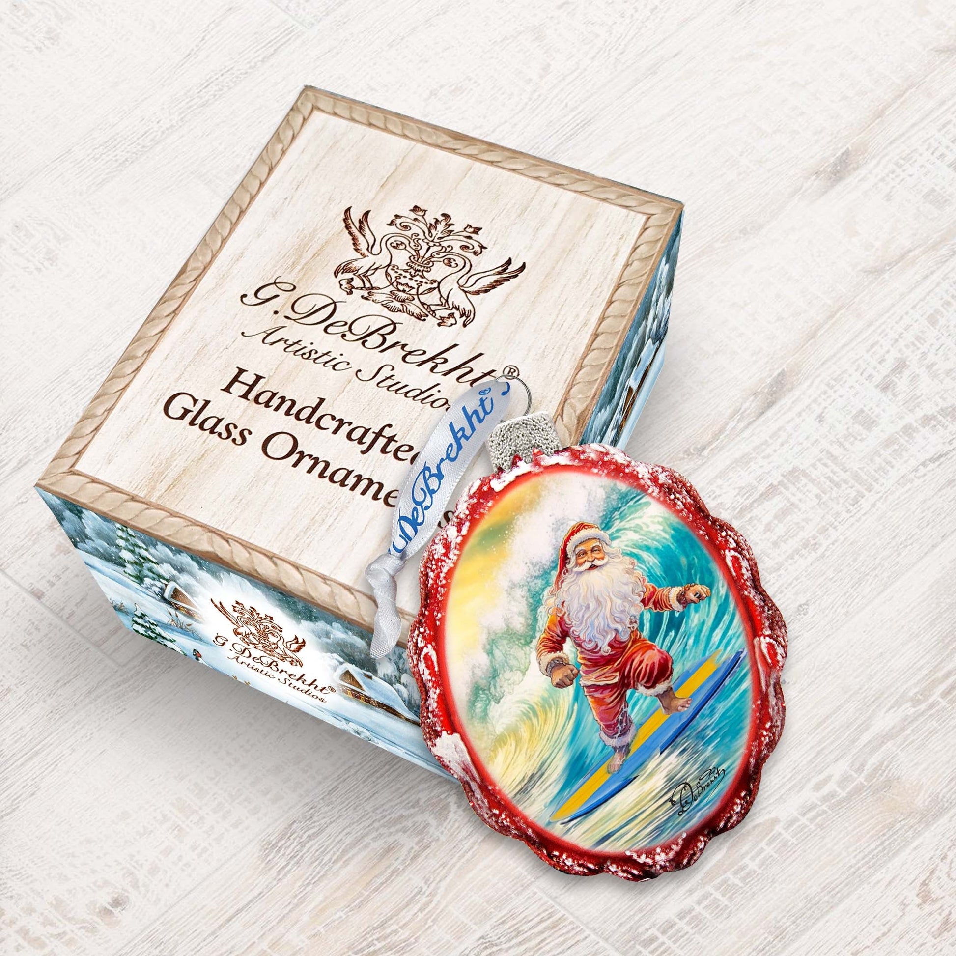 Coastal Christmas Ornaments Santa on the Surfboard Keepsake Glass Ornaments by G. Debrekht - Coastal Holiday Decor - 777392