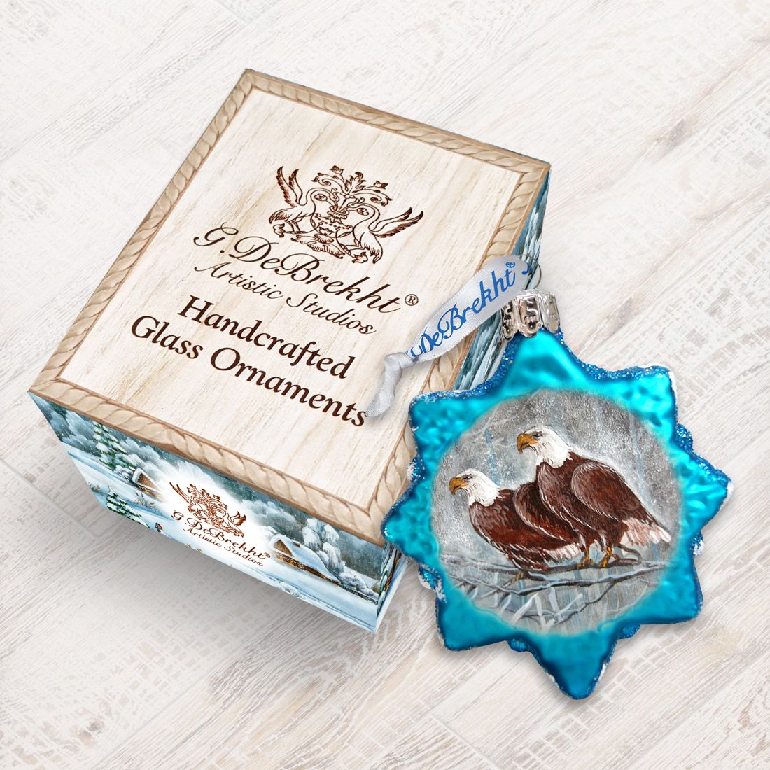 Looking for Eagles Family hand-blown Vintage Glass Christmas Ornaments? Discover our exceptional small glass ornaments- delightful creations, handcrafted, painted, and Décorated by skilled artisans at G. Debrekht artistic Studio- handmade in the USA
