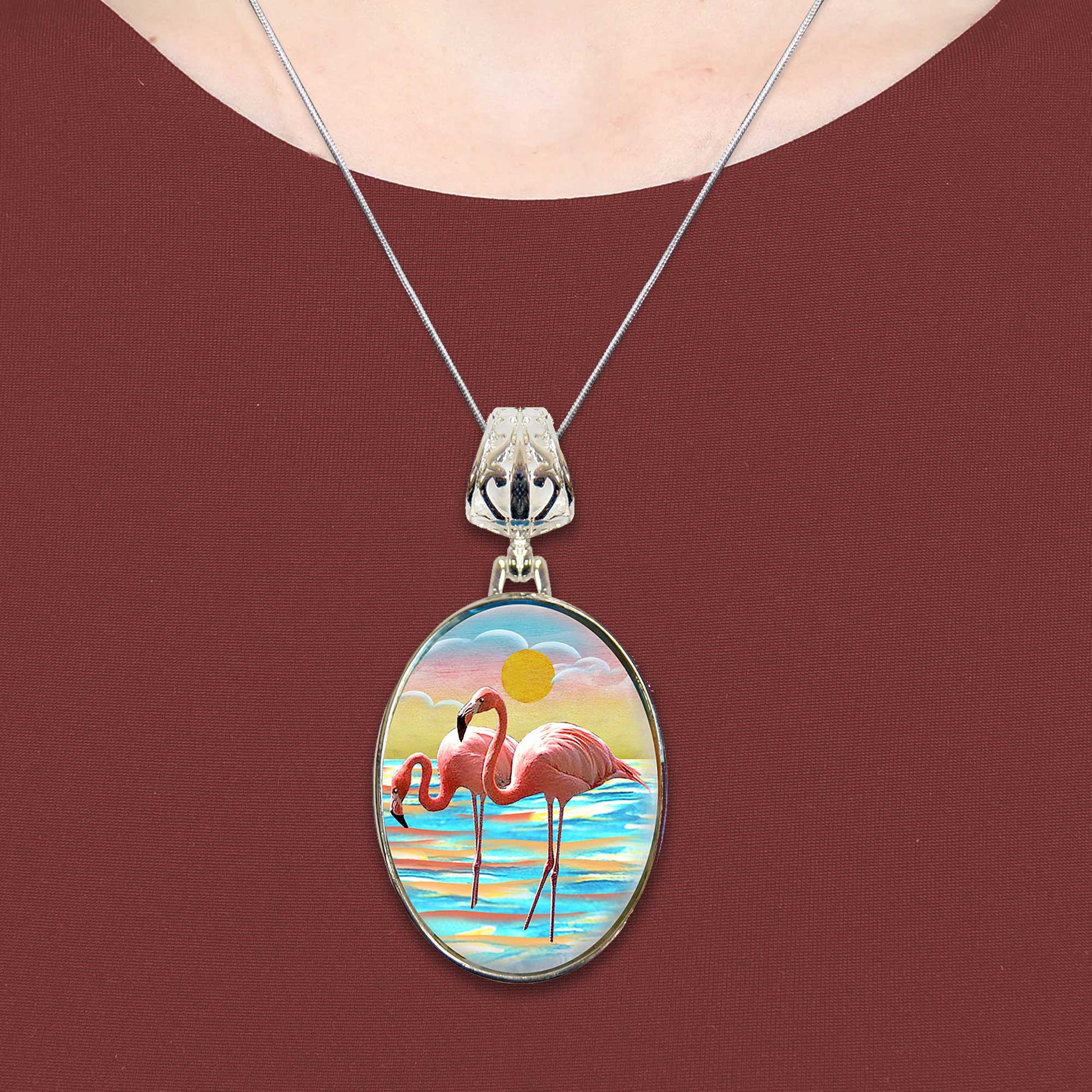 Flamingos Silver Plated Mother of Pearl Jewelry Pendant Necklace Coastal - 44046
