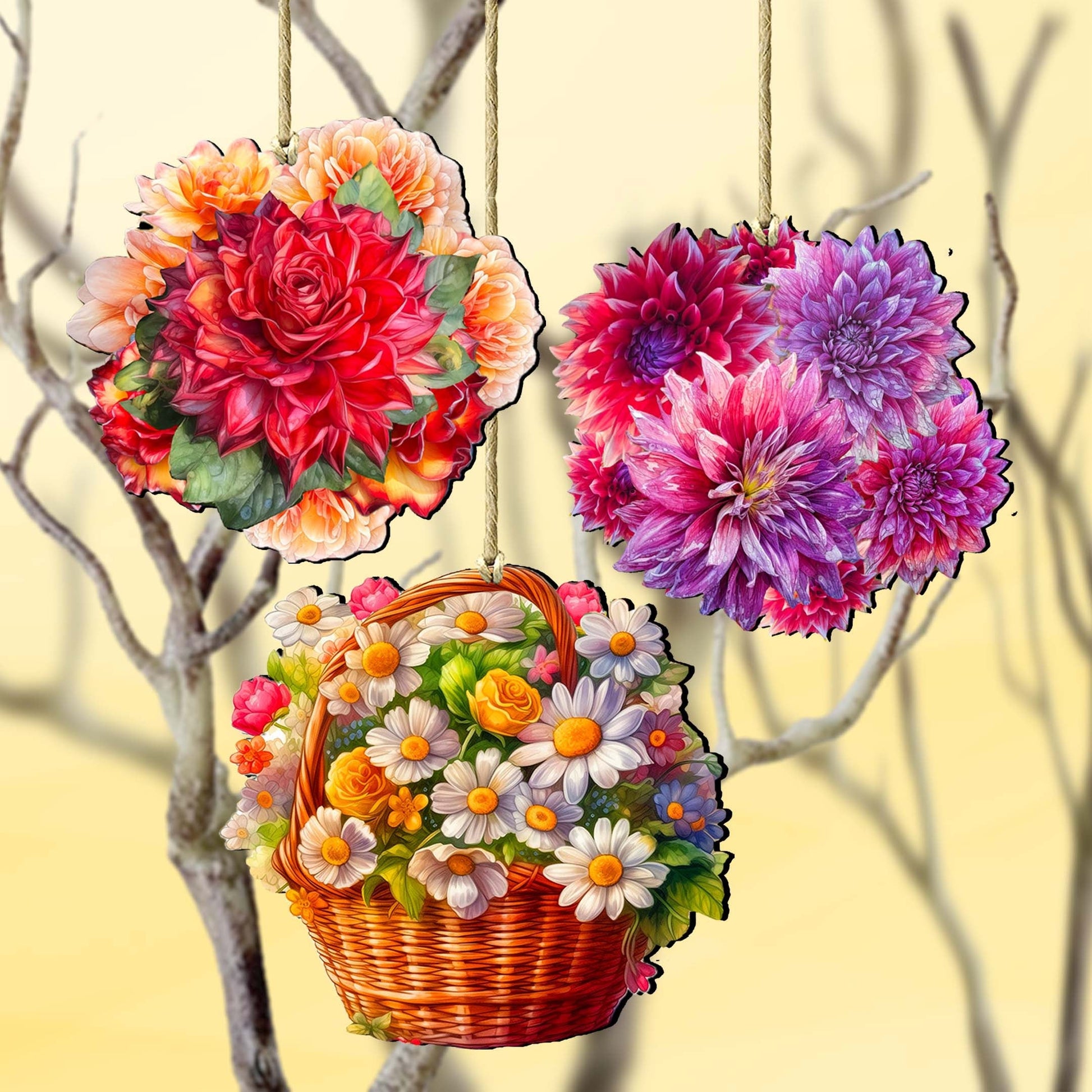Flower Bouquets Decorative Wooden Ornaments Set of 3 by G. Debrekht - Love Family Decor - 8091076-2-S3