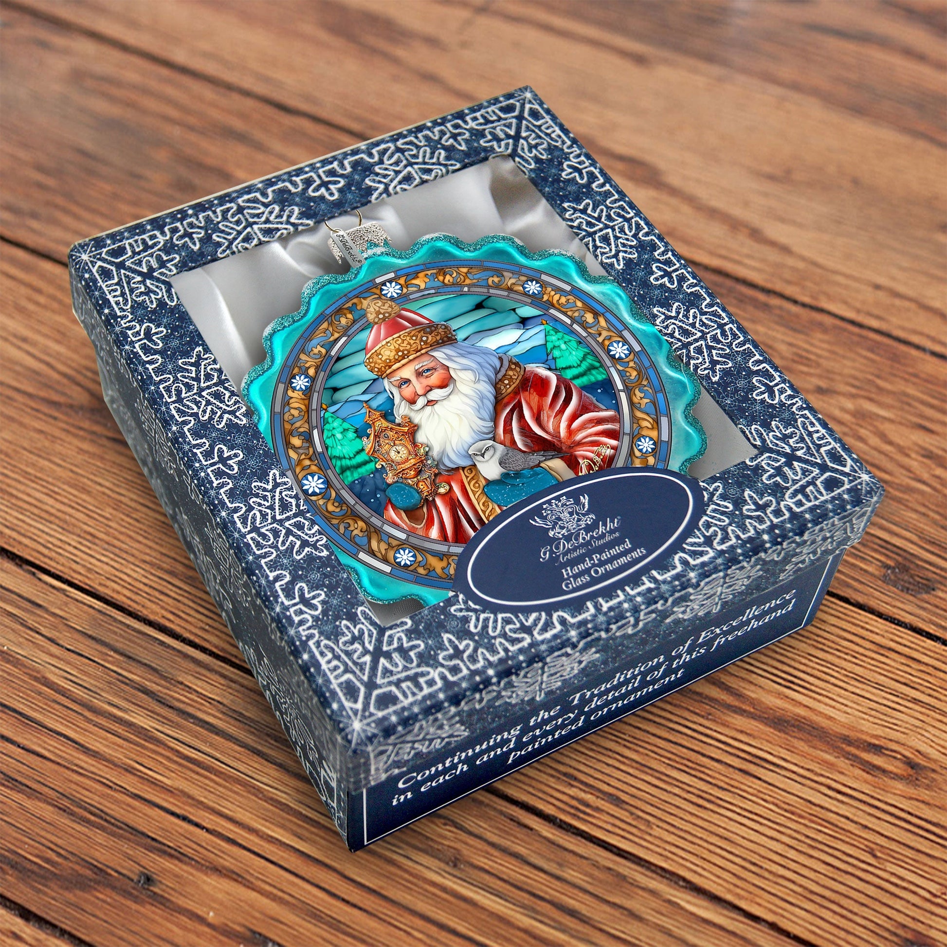 Add holiday cheer to your home with the Forest Christmas Wreath Glass Ornament. This festive ornament, designed by G. Debrekht, features Santa holding a bird and clock, reminding you of the countdown to Christmas. Crafted with intricate detail, it's perfect for your Christmas Decor.