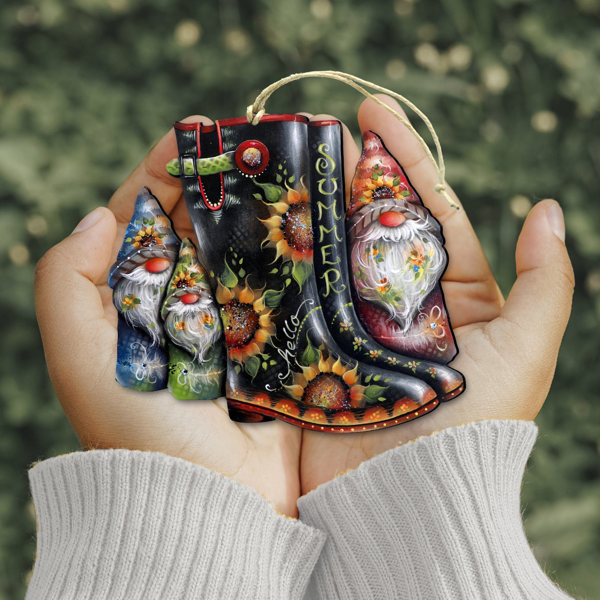 This wooden ornaments from the Hello Summer Boots collection by J. Mills-Price is the perfect addition to your family's home decor. The intricate design and vibrant colors bring any room a fun, summery feel. Ideal for giving as a gift or to hang in any space for a cheerful reminder of summer days.