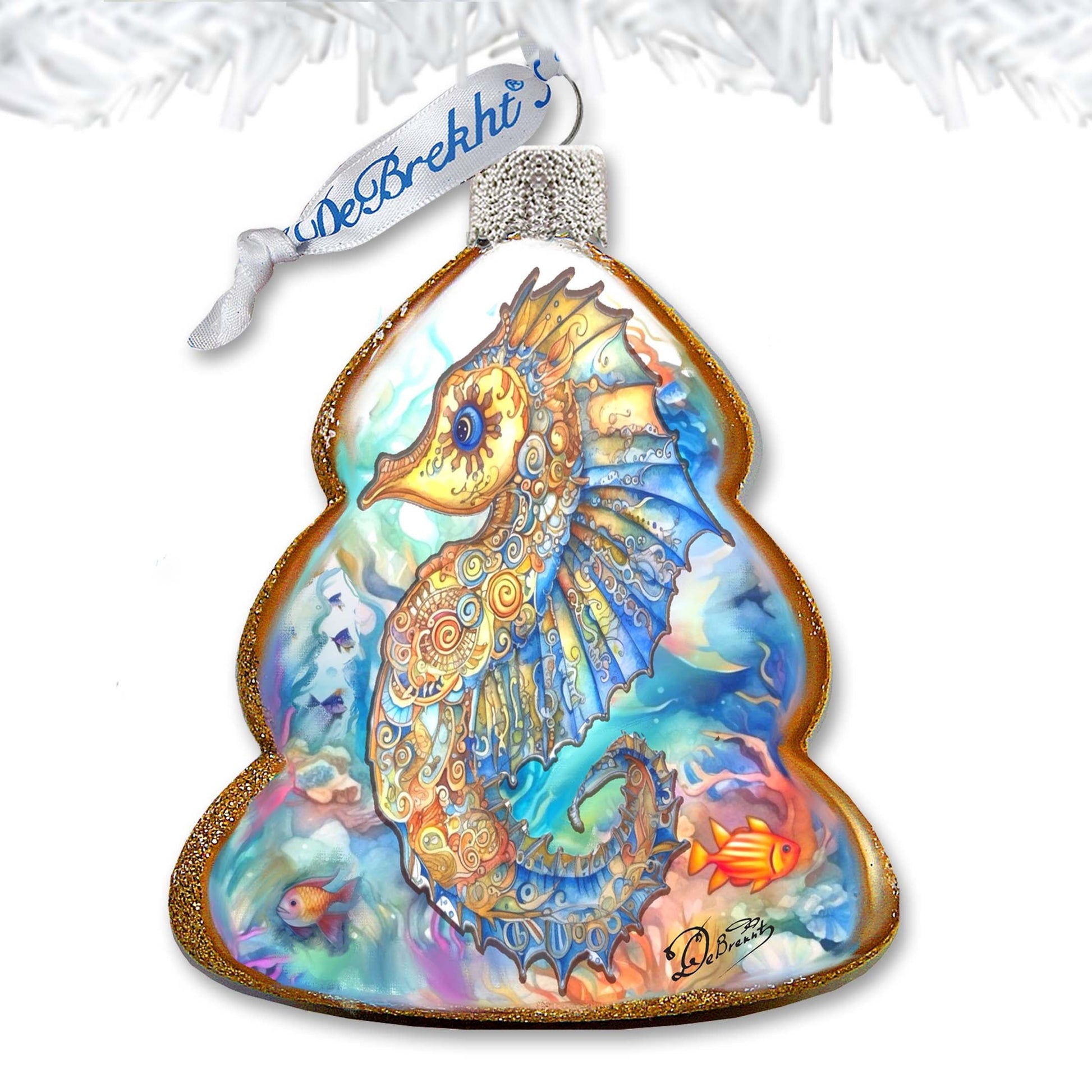 Enhance your coastal holiday Decor with these beautifully crafted Seahorse Keepsake Glass Ornaments by G. Debrekht. Made with exquisite details and quality materials; these ornaments are perfect for adding a touch of seaside charm to your home. Bring a piece of the ocean into your holiday celebrations.