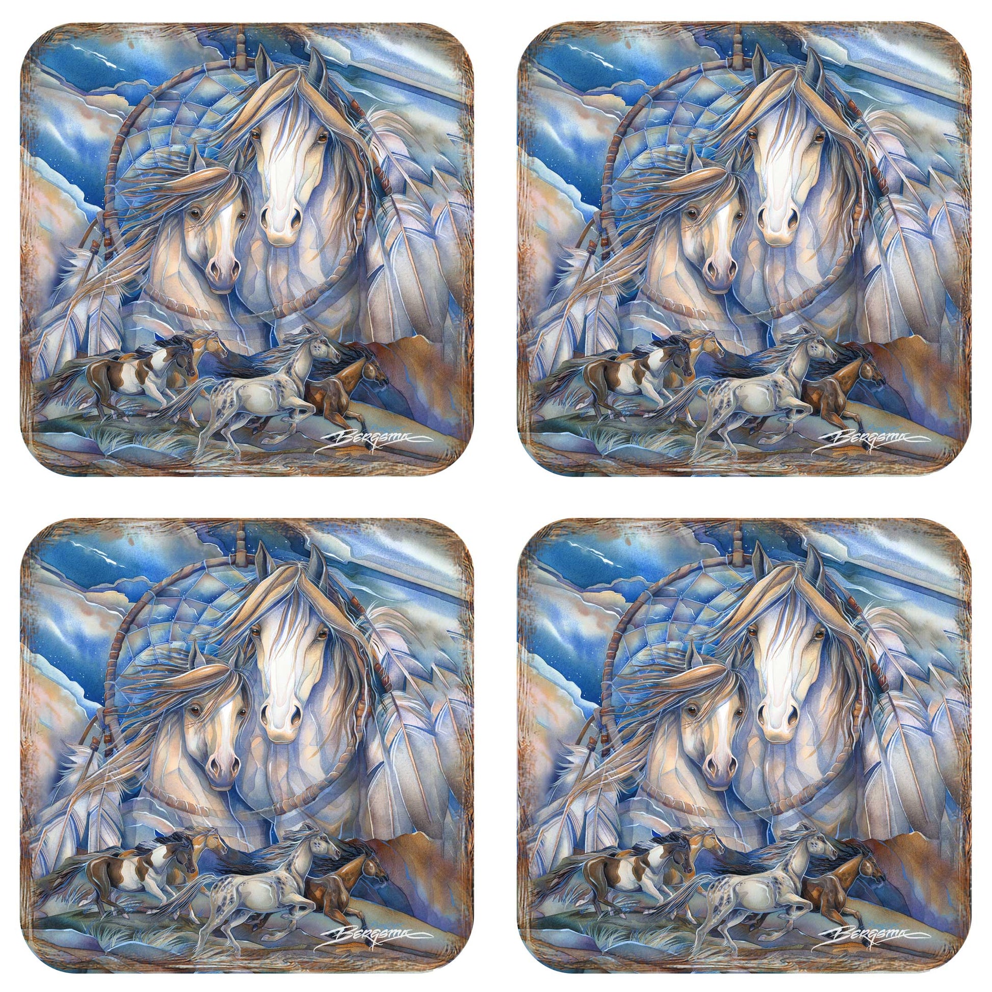Mustangs Dream Catcher Wooden Cork Coasters Gift Set of 4 by J. Bergsma - Wildlife Decor - 8199469C-S4