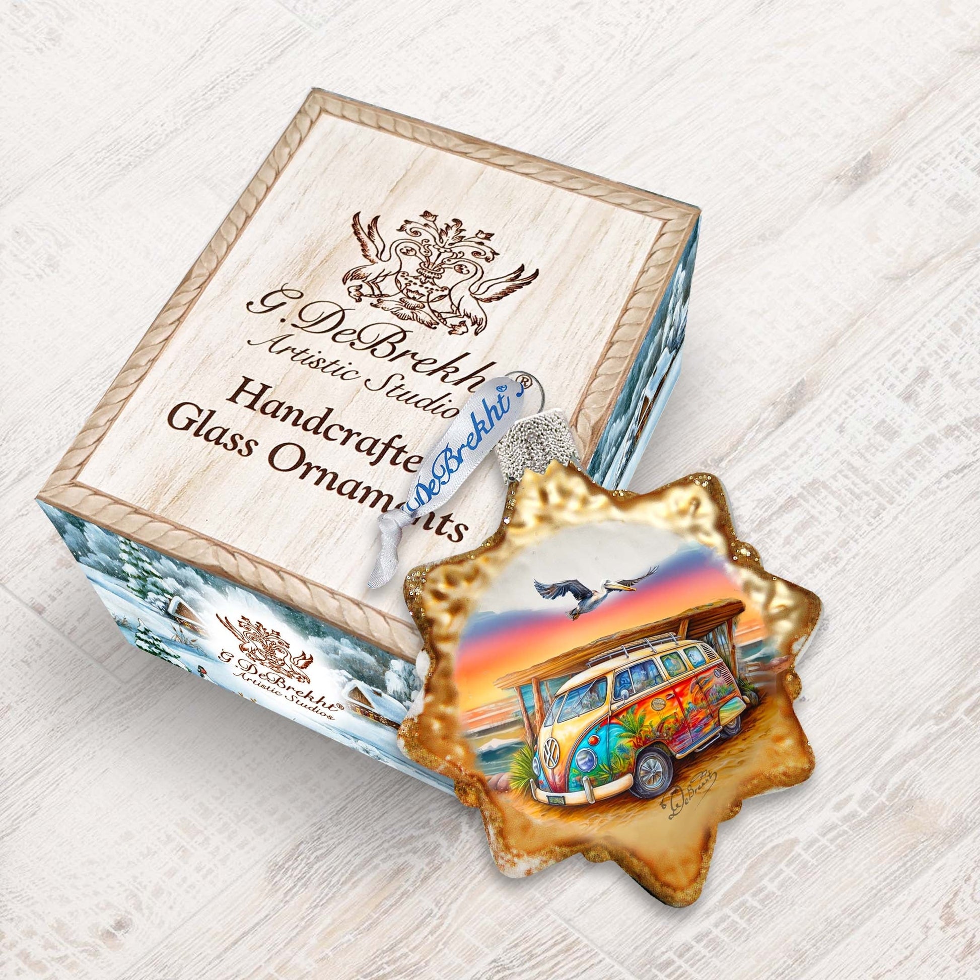 Add a touch of coastal charm to your holiday Decor with these Beach Van Keepsake Glass Ornaments by G. Debrekht. Crafted with intricate details, these ornaments feature a vintage beach van design that will remind you of your favorite seaside memories. They are a must-have addition to any nautical Christmas collection.