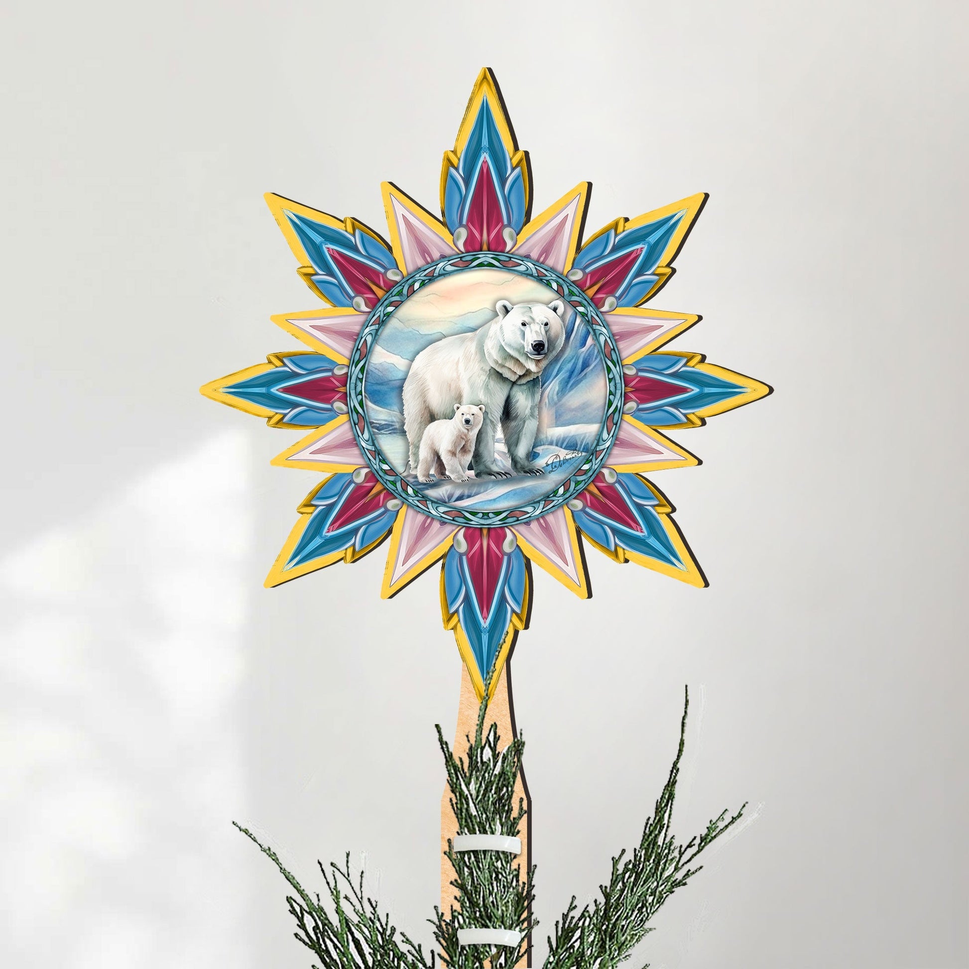Polar Bear with Cub Star Tree Topper Wooden Decor by G. Debrekht - Wildlife Holiday Decor - 89509
