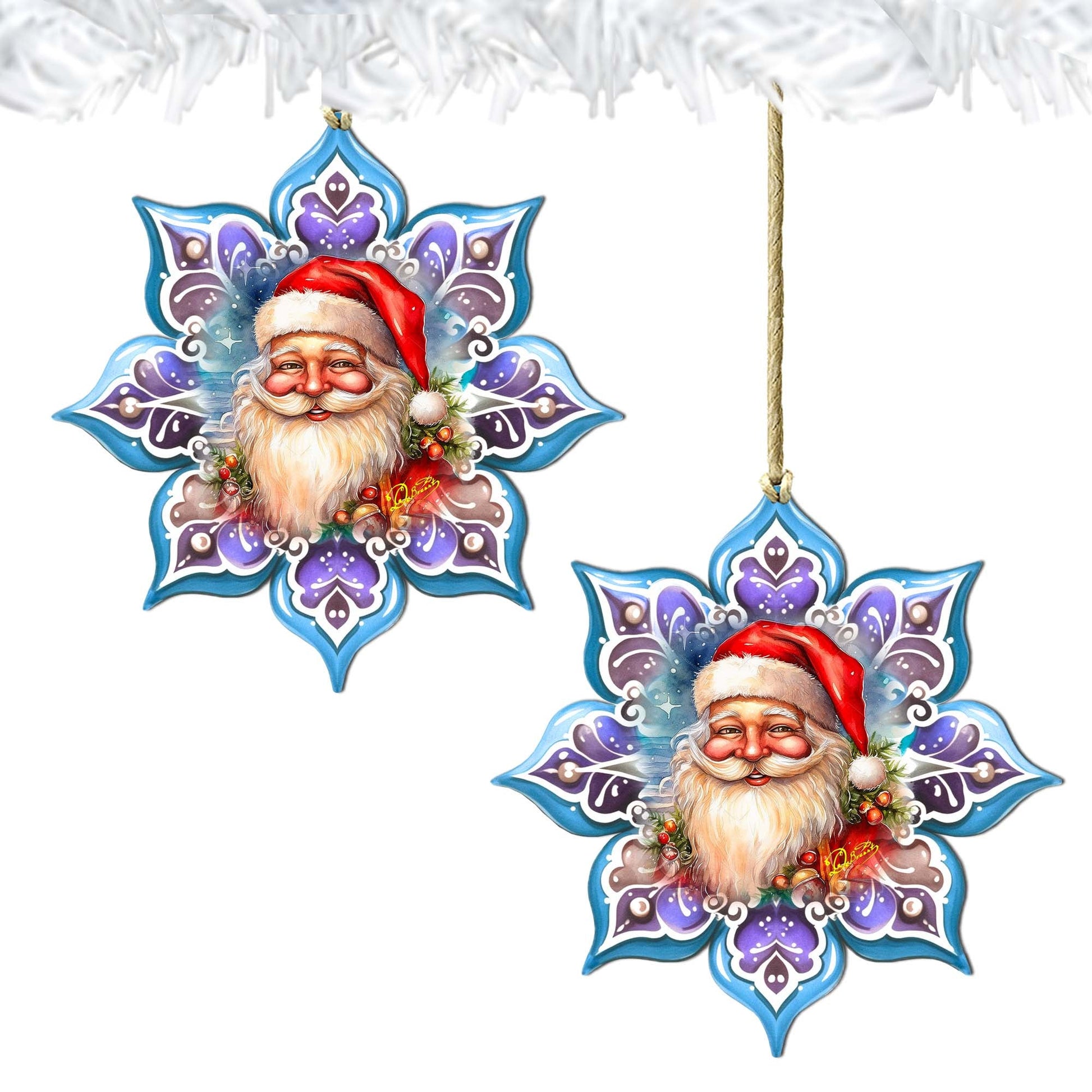 These exquisite Santa snowflake wooden ornaments by G. Debrekht bring a festive touch to your holiday Decor. Each handcrafted ornament showcases the skilled craftsmanship of G. Debrekht, adding a unique and charming element to your Christmas celebrations. Spread the holiday cheer with these beautiful and timeless ornaments.