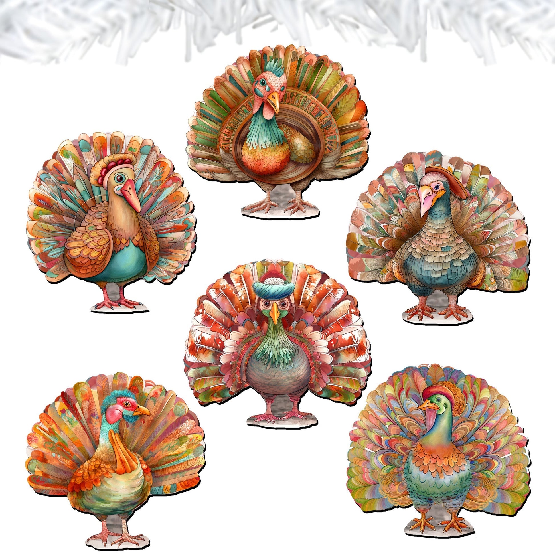 Turkey Decorative Wooden Clip-on Ornaments Set of 6 by G. Debrekht - Thanksgiving Decor - 8090027C-S6