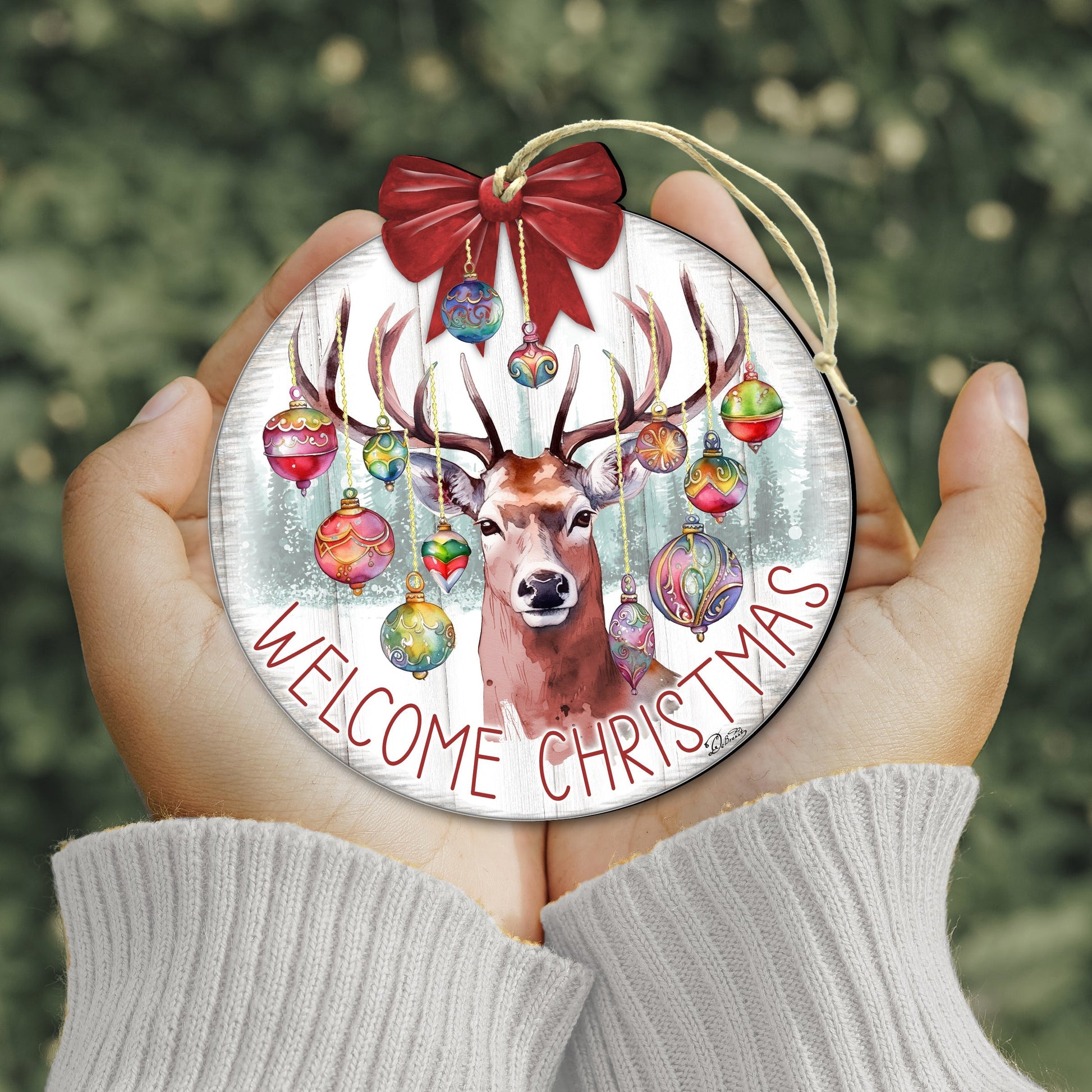 Welcome the holidays with G. Debrekht's Welcome Christmas Wooden Ornaments. These handcrafted ornaments feature a deer carrying a festive bundle of decorations. Enjoy the festive and unique look of these charming ornaments!
