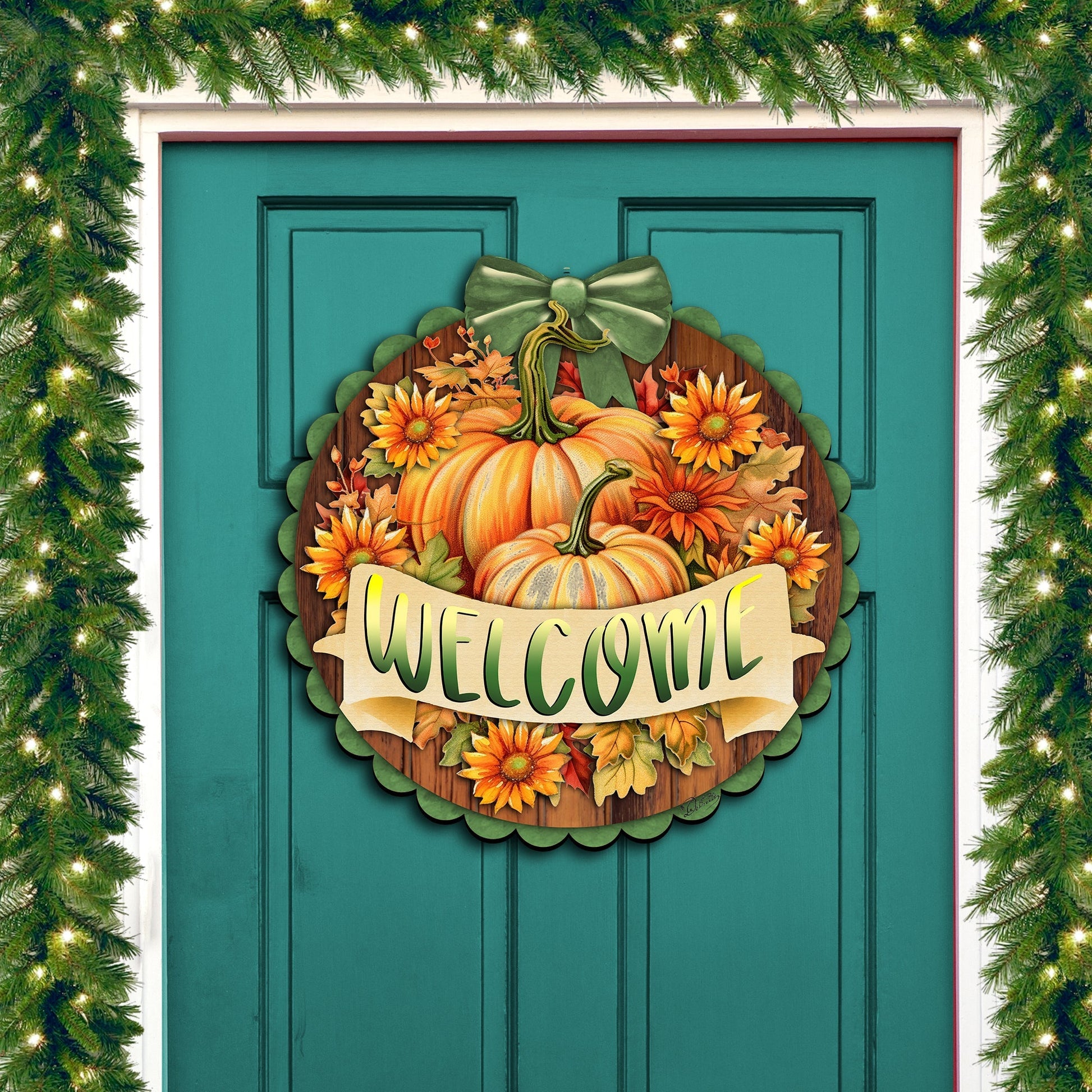 Welcome friends and family with this beautiful G. Debrekht wooden welcome sign. This piece is embellished with pumpkins and sunflowers, making the perfect festive Thanksgiving or Halloween porch decor. Crafted from wood, it will be a lasting addition to your seasonal decorations.