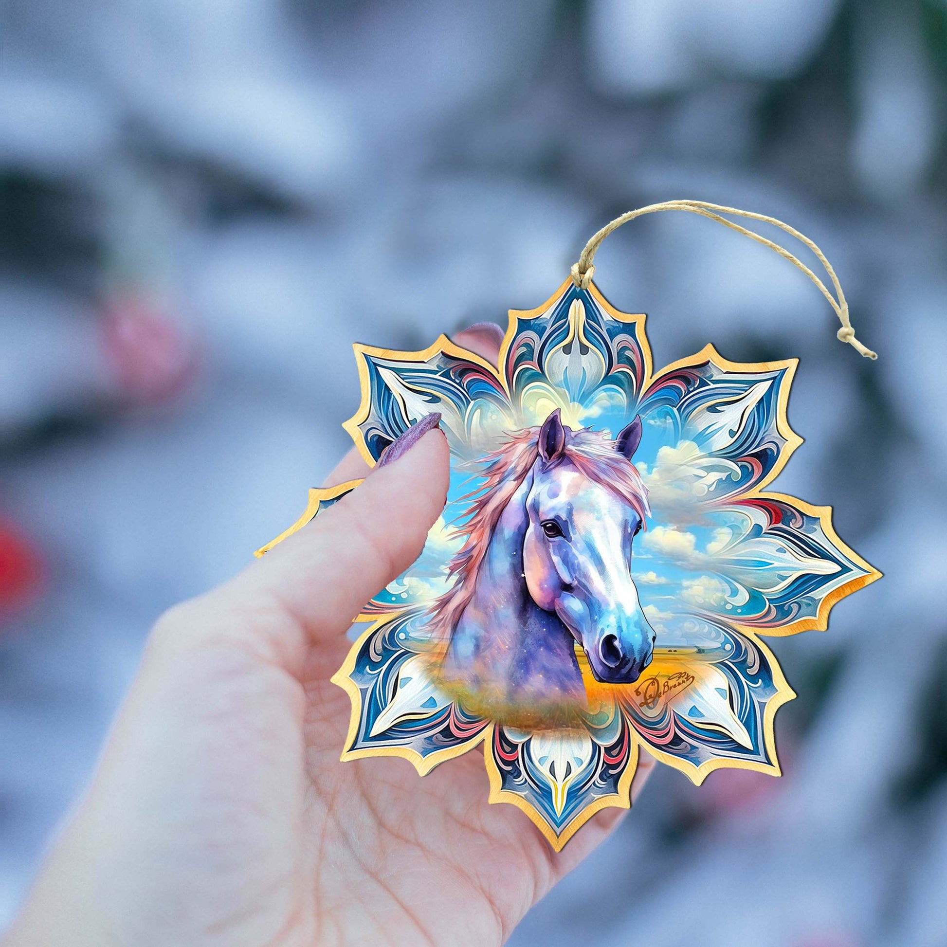Introduce a touch of nature to your holiday Decor with G. Debrekht's White Horse Snowflake Wooden Ornaments. Each ornament features a beautiful white horse and a delicate snowflake design, hand-painted on high-quality wood for a rustic and charming addition to your home.