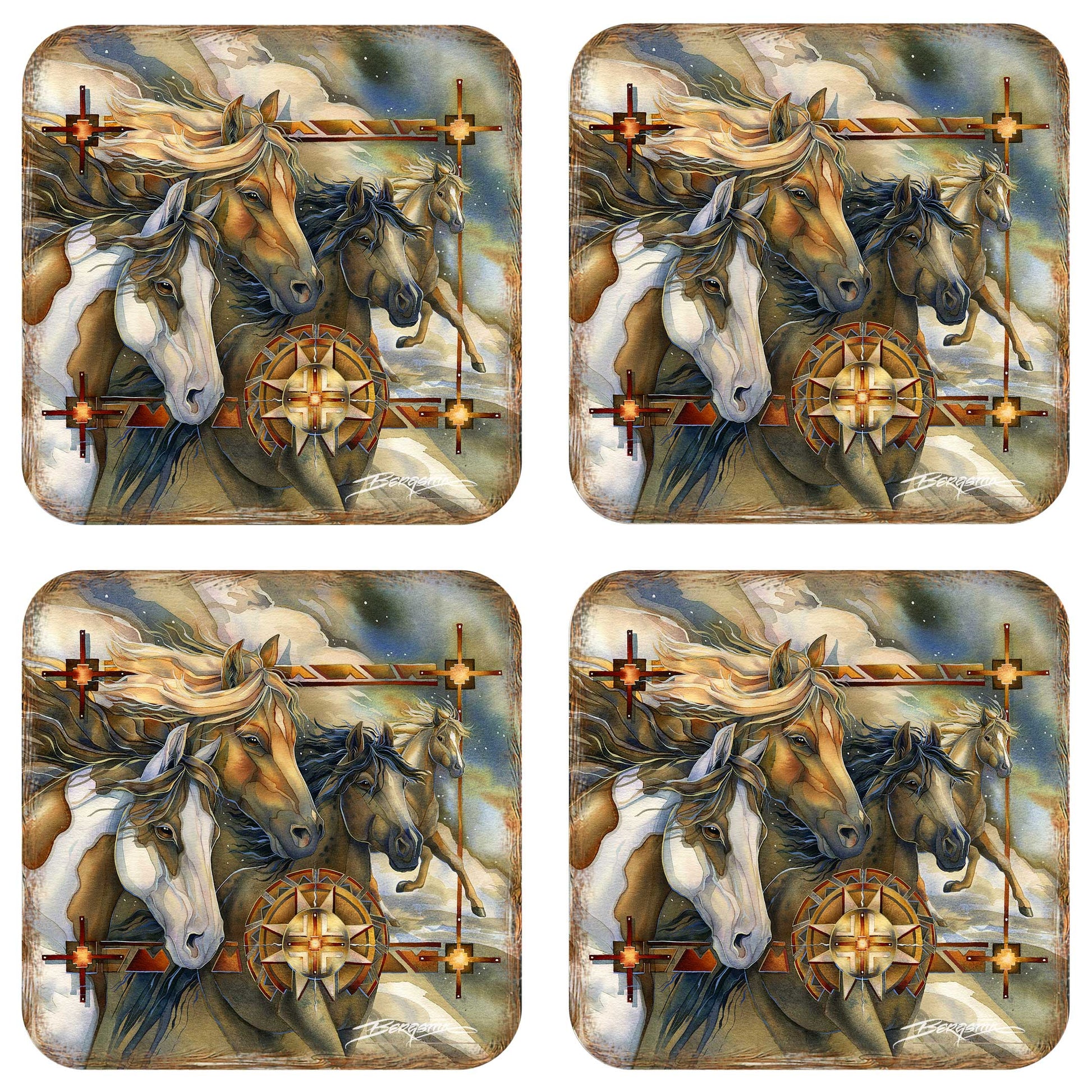 Wild Horses Wooden Cork Coasters Gift Set of 4 by J. Bergsma - Wildlife Décor - 8199474C-S4